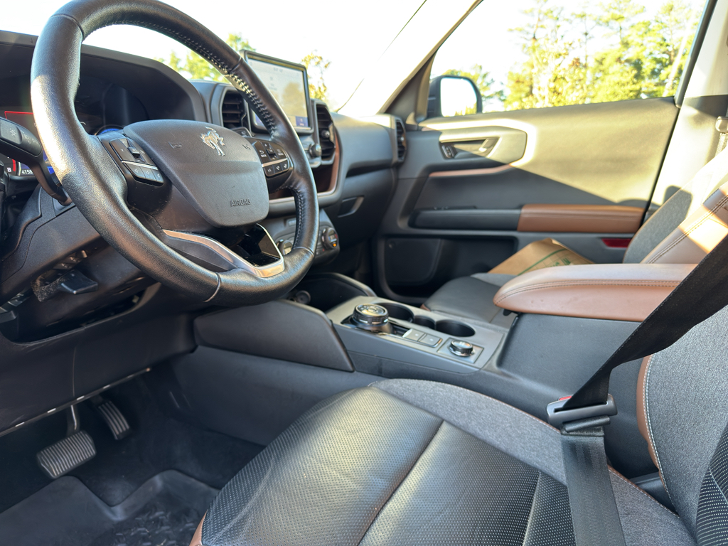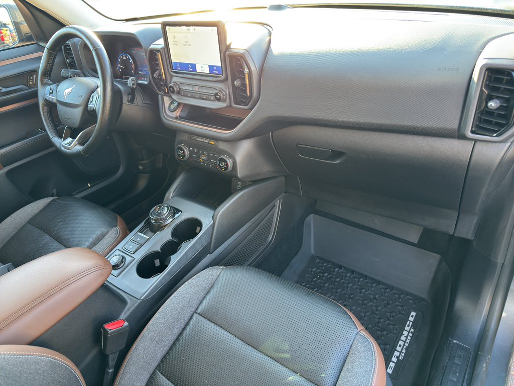 This 2021 Ford Bronco Sport warns of approaching vehicles with Cross-Traffic Alert. The leather seats in the Ford Bronco Sport are a must for buyers looking for comfort, durability, and style. The Ford Bronco Sport keeps you comfortable with Auto Climate. Bluetooth technology is built into it, keeping your hands on the steering wheel and your focus on the road. Start this 2021 Ford Bronco Sport from inside with remote start. The rear parking assist technology on this mid-size suv will put you at ease when reversing. The system alerts you as you get closer to an obstruction. This model is pure luxury with a heated steering wheel. The Ford Bronco Sport comes equipped with Android Auto for seamless smartphone integration on the road. The Ford Bronco Sport has a clean CARFAX vehicle history report. See what's behind you with the back up camera on it. Good News! This certified CARFAX 1-owner vehicle has only had one owner before you.When you encounter slick or muddy roads, you can engage the four wheel drive on it and drive with confidence. This 2021 Ford Bronco Sport comes equipped with Android Auto for seamless smartphone integration on the road. Apple CarPlay: Seamless smartphone integration for this model - stay connected and entertained on the go! This mid-size suv offers Automatic Climate Control for personalized comfort. The high efficiency automatic transmission shifts smoothly and allows you to relax while driving. See what's behind you with the back up camera on this 2021 Ford Bronco Sport . This vehicle is a certified CARFAX 1-owner. Our dealership has already run the CARFAX report and it is clean. A clean CARFAX is a great asset for resale value in the future. Maintaining a stable interior temperature in the vehicle is easy with the climate control system. The vehicle warns of approaching vehicles with Cross-Traffic Alert. Easily set your speed in this mid-size suv with a state of the art cruise control system. Increase or decrease velocity with the touch of a button. The Electronic Stability Control will keep you on your intended path. This mid-size suv has a 3 Cyl, 1.5L high output engine. The fog lights cut through the weather so you can see what's ahead. Enjoy the tried and true gasoline engine in it. This mid-size suv emanates grace with its stylish gray exterior. Bluetooth technology is built into this mid-size suv, keeping your hands on the steering wheel and your focus on the road. This vehicle is pure luxury with a heated steering wheel. The leather seats in this Ford Bronco Sport are a must for buyers looking for comfort, durability, and style. With the adjustable lumbar support in the Ford Bronco Sport your back will love you. This mid-sized SUV is perfect for your next adventure. The state of the art park assist system will guide you easily into any spot. Never get into a cold vehicle again with the remote start feature on this model.